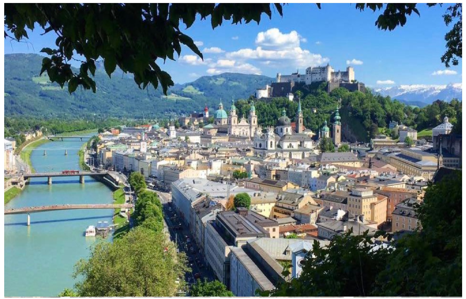 The two starting their elucidative journey venturing to the 241 mile long Salzach river which flows into the Johann Strauss music acclaimed Danube. Viewing Wolfgang Medias Mozart’s birthplace home on the river’s edge, and from the pedestrian river bridge, able to behold the majestic Hohensalzburg Fortress in the distance. Their walking tour taking them to the center of historic Salzburg. The Residenz Brunnen fountain residing in the center of the old town square.