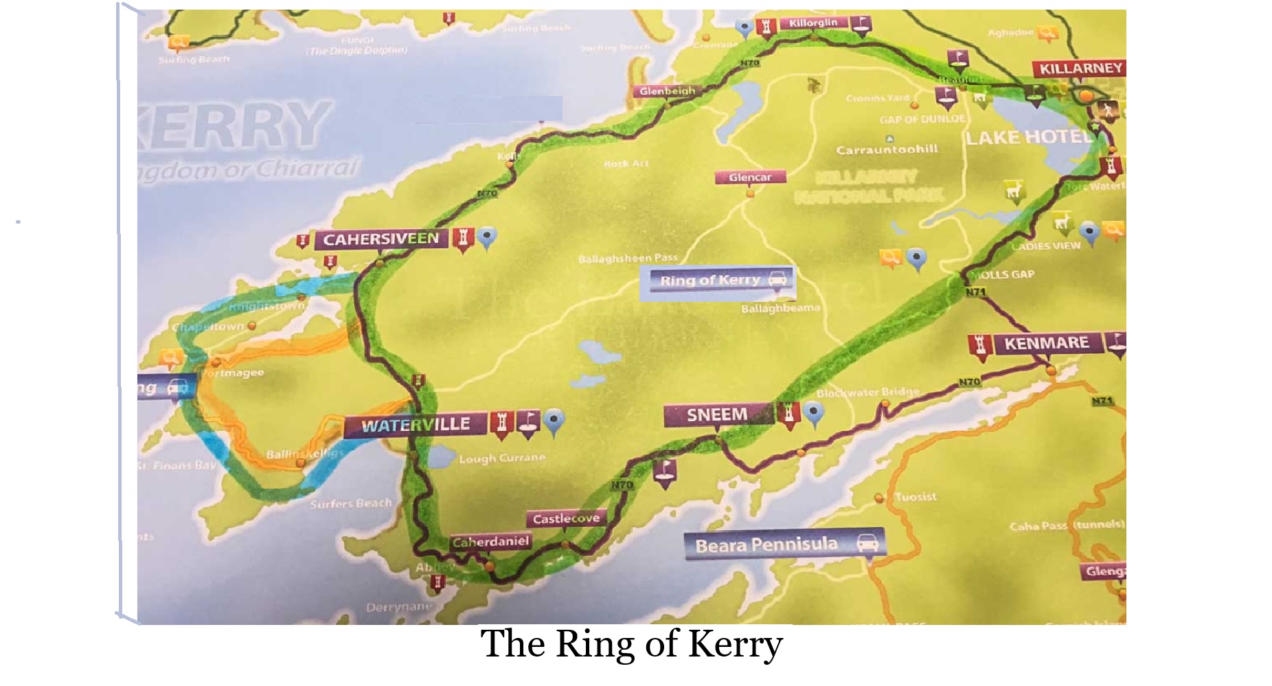 The Ring of Kerry is a hundred and eleven mile circular tourist route, running clockwise south from Killarney, following the highway to Kenmare, then the up around the Lveragh Peninsula to Killorglin, going through several hamlets before returning to Killarney. The scenic route takes in the sea coast beaches, Tore Waterfall, Ross Castle, as well as other historic presentations. the adventurers having entered the realm of the ring in Kenmare, viewing the Greenland Circle of stones, the site being what is called a disturbed site, at one time having nine stones standing, but only four remained. The hour waning, having secured directions to Misses Lovett’s Farm, 2 miles out of town, their host for the nights lodging, it was time to call it a day.