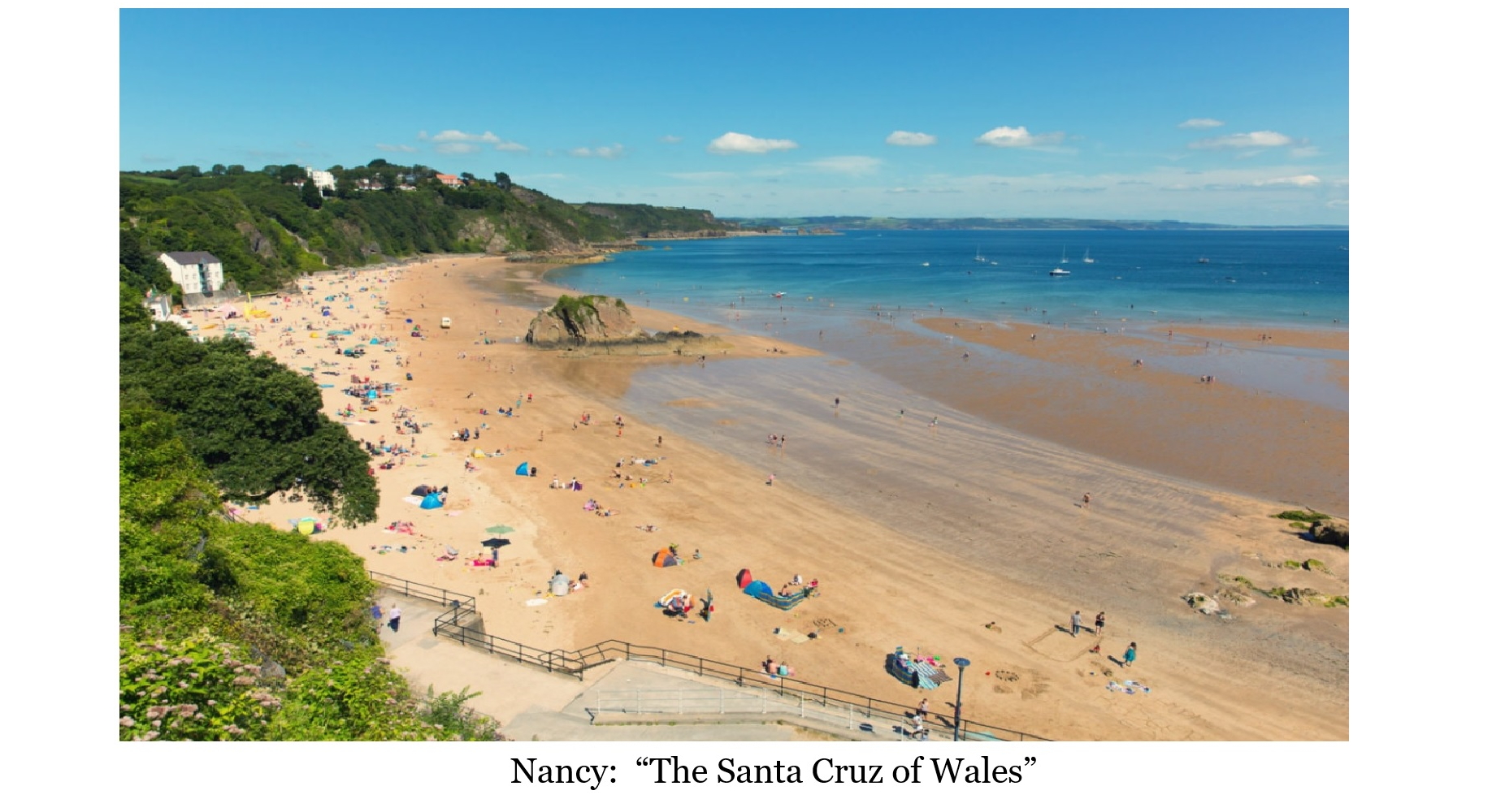 Nancy’s day beginning with the sites of Tenby, finding the wall that enclosed the original 12th century town very impressive with its 4 gateways and several small towers, built in 1133. in 1457, the walls were raised in height and widened to allow the garrisons movement. The moat surrounding the town was also widened to a width of 30 feet. She was somewhat disappointed when discovering all that remained of the 1133 Tenby castle on a rocky promontory facing the sea, was a token ruin. Standing on Castle hill she could viewing the 2 ½ mile of pristine beach, Nancy humoursly rationalizing to herself, it was the Santa Cruz of Wales.