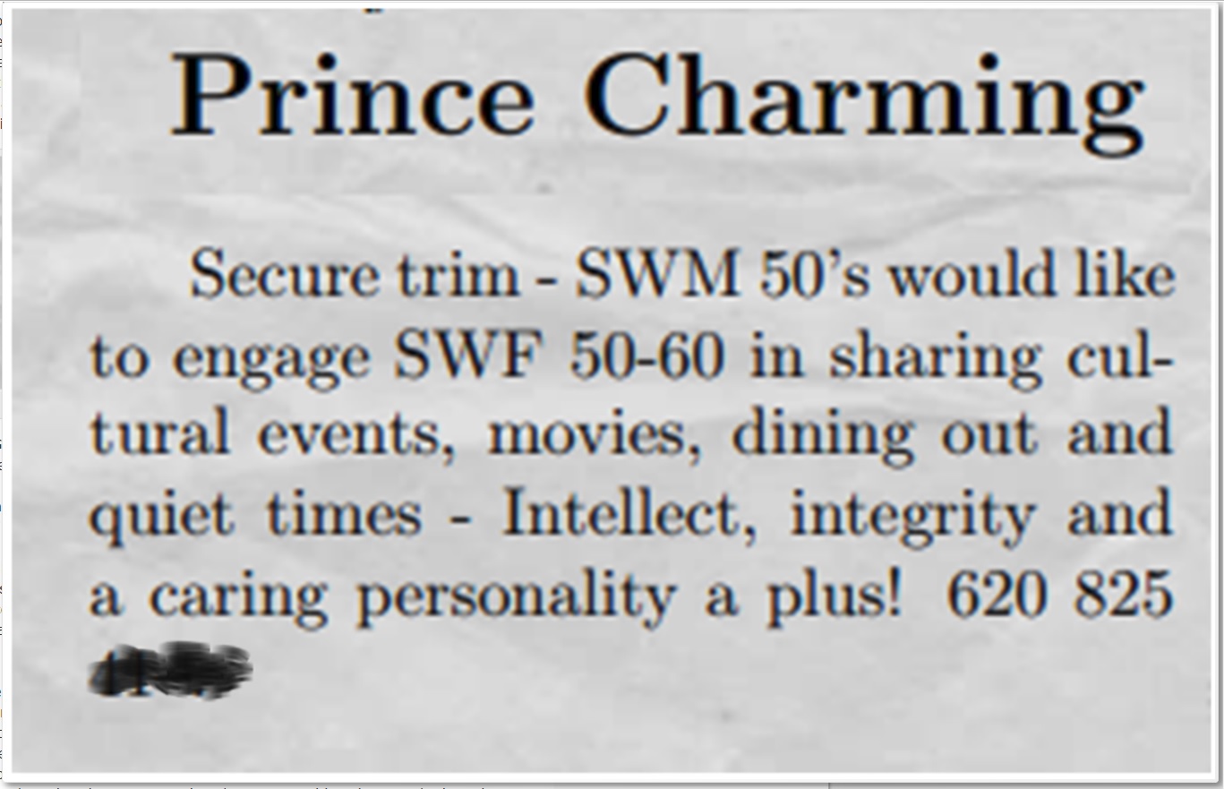 Placing a call to the Eagle society page editors number, a lady answered, cordially taking the prescribed ad, then posing a question, “how do you want it titled?” Gary was somewhat perplexed at the unexpected question, hesitantly he replied he didn’t know, what do you think?, the lady replying, “well, you sound like A Prince Charming, how about that”. The week-long wait was finally over, the Thursday morning paper arriving, there in bold print, the lady was true to her word. As the weeks progressed Gary’s answering machine having several messages from the opposite gender briefly introducing themselves leaving their number.
