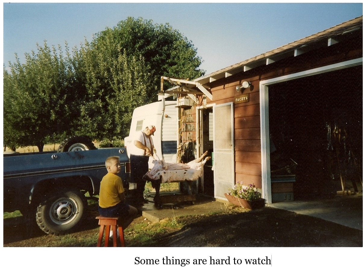 A morning found Robert as an observer. Fess, backing his pickup to the shop door, the arm of the hoist protruding, its cable lowered, lifting a hog up out of the bed by its hind legs, then lowering to a metal platform on rollers. Robert remained watching, Fess with knife in hand began the butchering process, a decision to leave was hesitant, but would be forthcoming, Gary understood, having watched Fess harvest a live steer from start to finish when he was Roberts age.