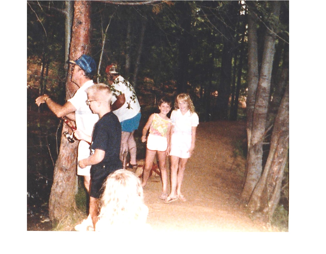 A late morning journey found the family following Jerry and Fess and two of their granddaughters south of town then turning at the French Creek bridge onto a mountain dirt roadway in the Cavalier. The excursion continuing then coming to a conclusion, stopping at what appeared to be a public picnic area with tables and in a tree shaded reach, the calling sound of the flowing creek. Jerry, who had the foresight to pack a picnic lunch mentioned it was time to eat. French Creek that was nearby beckoned, Fess whom on this day like most, just happened to have fishing poles, Gary and Robert partaking of the invitation, but alas, a catch to no avail.