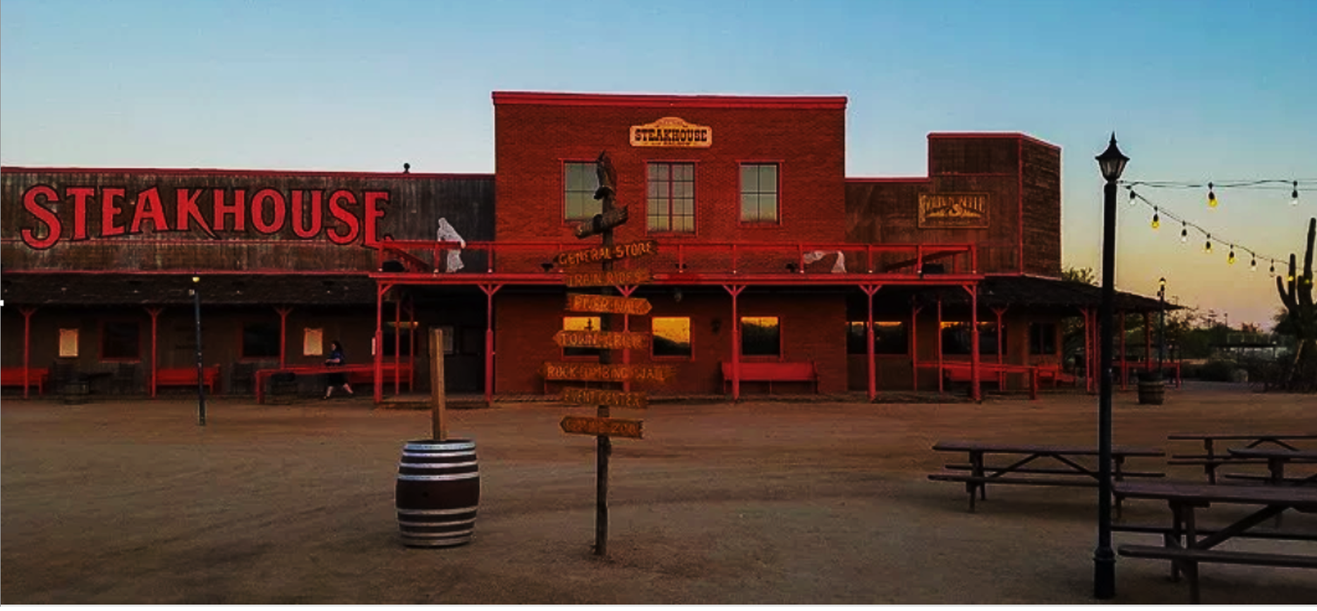The evening concluding with dinner at the Rawhide Steakhouse, the two families in an outdoor patio setting, enjoying the crowning point of the evening, a mesquite flame broiled steak. The entertainment continuing at the steakhouse with an unusual circumstance, if a patron ordered a well done steak, upon the servers arrival, beneath a cover they would discover a well done smoking cowboy boot on a platter, a novice Rawhide Ranch idea for remembrance.