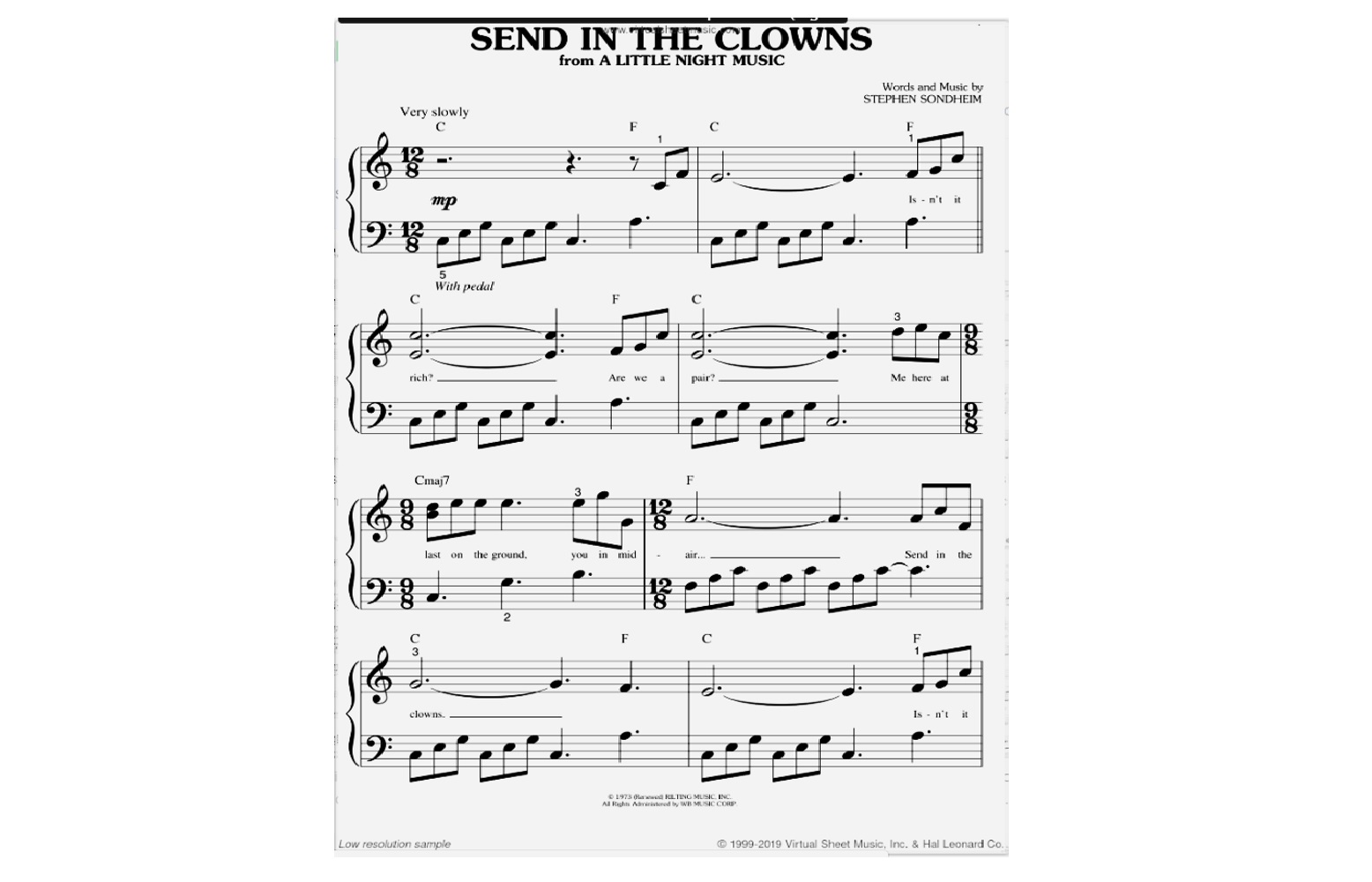 Gary vaguely recalling the Send In The Clowns song, and not possessing a recording for his musical ear to posture, realizing he would be compelled to buy the sheet music. Once purchased, another discovery, the score was written with a 12/8 temporal signature. The up’ed waltz time beginning was perceptible, but, the bridge presented a problem, it wasn’t registering with the non sight reading musician.