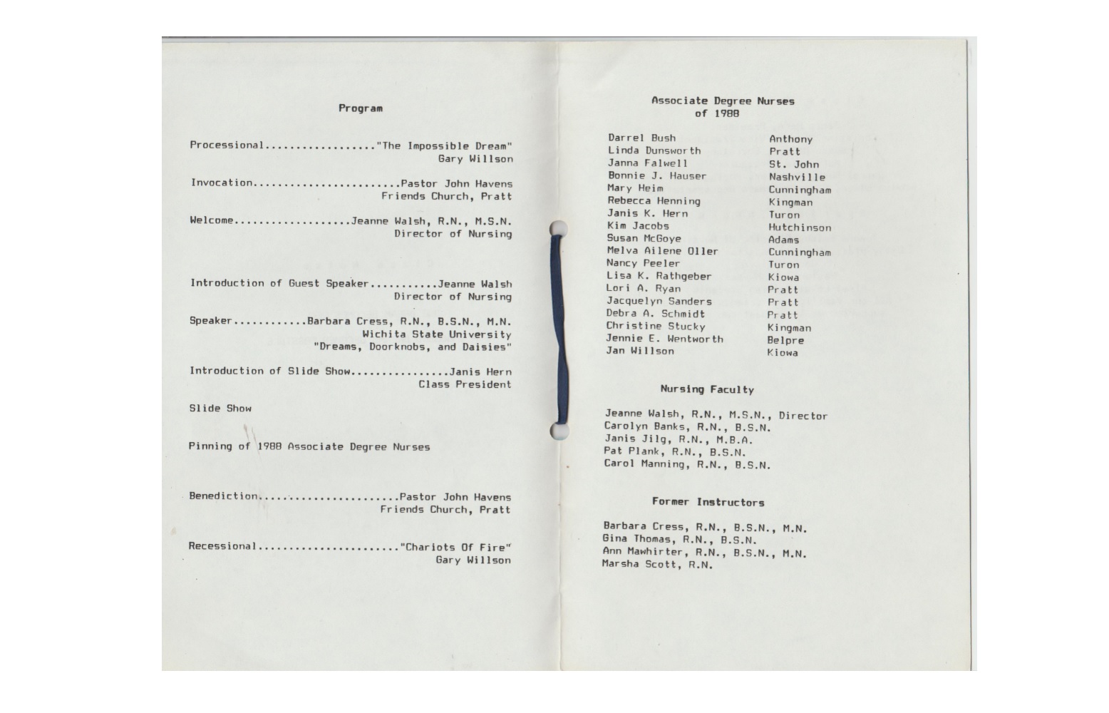 The evening of Pratt Community College graduation ceremony having arrived, the gymnasium was suffused with friends, family and all the consolidated graduates of the class of 1988 from the divergent career majors. A vocalist and pianist commenced the all class program, continued with multifarious address’s from college and guest dignitaries, followed by an acknowledgement of the graduating students with a replica of diploma’s for their accession. The student gathering diverging, Jan’s diminutive sized nursing class leaving the arena, to a lecture auditorium, addressed with a stage and raised seating