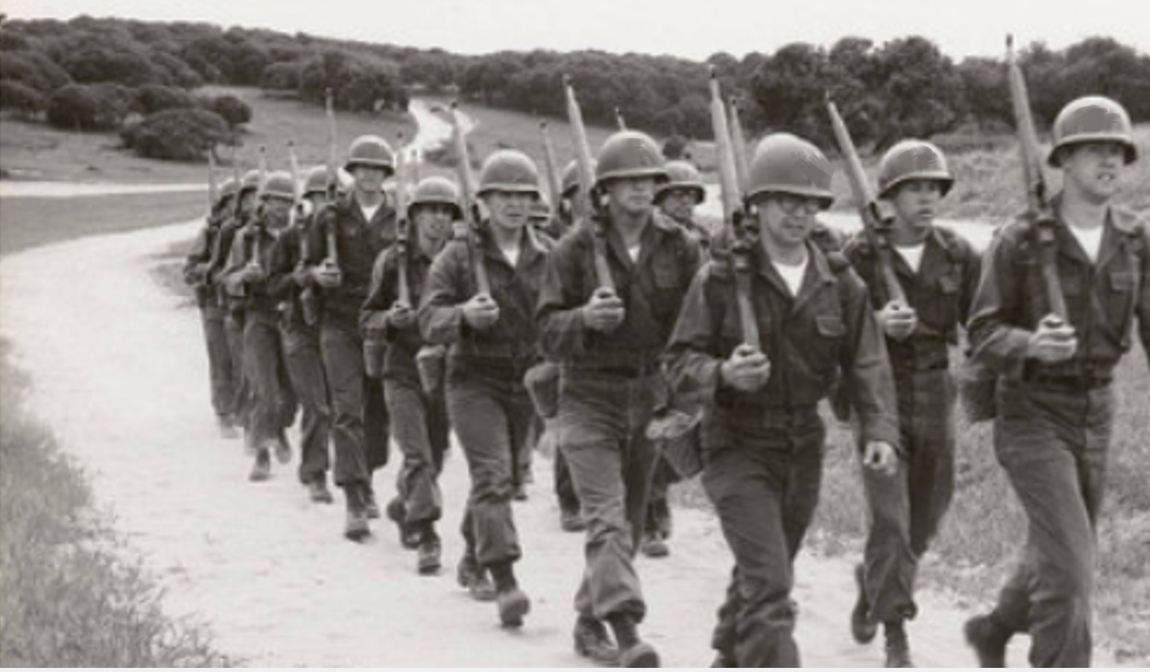 The physical training aspect was never a concern to the young trainee, the P T calisthenics were routine except for those gung-ho individuals having enlisted to go “Airborne”, and were subject to an added P T program after the company had been dismissed. The continuous daily regimen of marching displayed a difficulty for some, the company instep-columns was normally confined to the streets and parade field except when tracking the attenuated paths to the field exercises on the East Range. Gary soon experiencing the 4th squad of the 4th platoon at the rear of the Company was susceptible to the accumulated dust of the procession. It reminded him of being in the last wagon in a western movie wagon train, subject to all the airborne crustaceans created by those proceeding him. It was by coincidence being appointed and later volunteering as a rear guard when the company was on the paved roads, discovering once in the field he could lingering far enough behind the columns, enabling most of the dust to clear.
