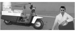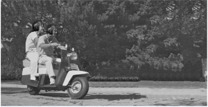 Dale Spady, a onetime classmate and cohort friend since junior high, having moved to Castro Valley. Dale had a different a set of transportation circumstances. The accosting difficulty was, his mother was a driver, thus limiting his use of her car. Dale finding a remedy, procuring a two-wheeled motorized appliance, a used 5 horsepower Cushman motor scooter, which in the proper weather conditions provide dry transportation. When Dale visited, Gary found there was room to sit on the rear jump seat, not exactly cool, but still a means for traveling between their two homes. Gary noticing, although the Cushman speedometer registered as much as 60 miles per hour, in reality, top speed was about 45, so when traveling to Castro Valley, they would avoid the MacArthur Blvd and it’s Highway 50 interchange, taking the back way, up Estudillo Avenue in San Leandro to Lake Chabot road, and around the lake to the towns back door entrance.