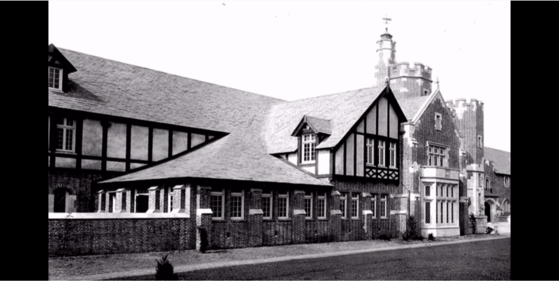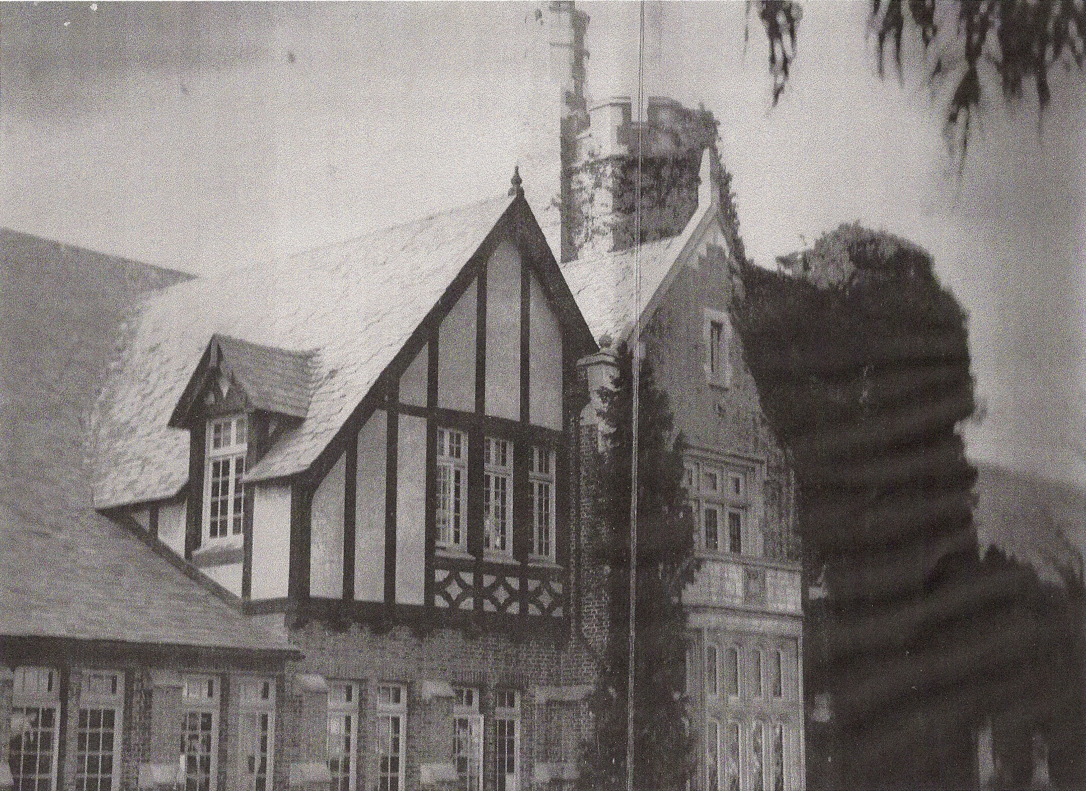The southwest wing adjacent to the tower  provided separate slate roof offices for the vice principal with the principal’s office having a side entrance to an extended terrace, the second floor finished in Tudor half-timber.  To the northeast was the covered gate entrance to the rear of the property, lined with the shops.
