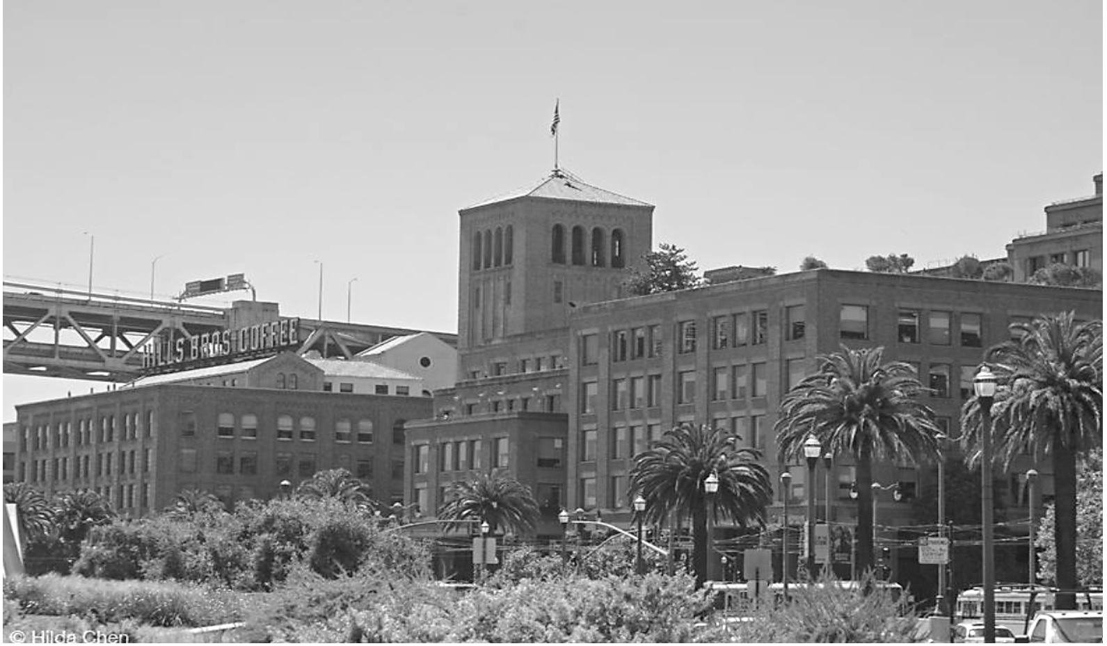 Continuing on, the Bay Bridge denizens within the trafficking would have no difficulties identifying their present location once having traversed this approach to the populated citadel of San Francisco. All who arrived on this commanding Bridge were greeted by a recognizable fragrance, but most not knowing the aromatic bouquet was the product produced by Hills Brothers Coffee, a redolent San Francisco welcome, its domain domiciled on Harrison Street and the Embarcadero below the bridge. On this day, Hills Brothers again proclaiming a San Francisco welcoming.