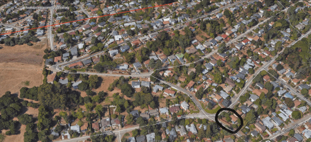 Mike’s house (circled) less than 6 blocks from the Hayward Fault.