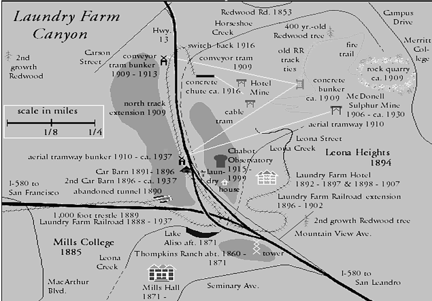 The Leona Heights sulphur mines began operation east of the Laundry Farm Canyon in 19 oh 6, the project of Francis Marion twenty mule team Borax Smith, a Oakland businessman and civic leader born in Richmond Wisconsin in 1846, leaving Wisconsin at the age of 21, to prospect for mineral wealth in the West, making his fortune in borax mining, but also invested locally in real estate. the innovating Borax Smith having a bunker built at the railway car barn at the laundry farm Canyon site connecting an aerial cable tramways to the sulphur mines, able to transport over Two hundred thousand tons of Iron Sulfide, known as Pyrite from the Leona Heights Mine. The mineral was trammed by aerial tramway down the hill to a sizing mill, crushed and shipped by railroad to Stauffer Chemical Company in Richmond for the manufacturing of sulfuric acid .