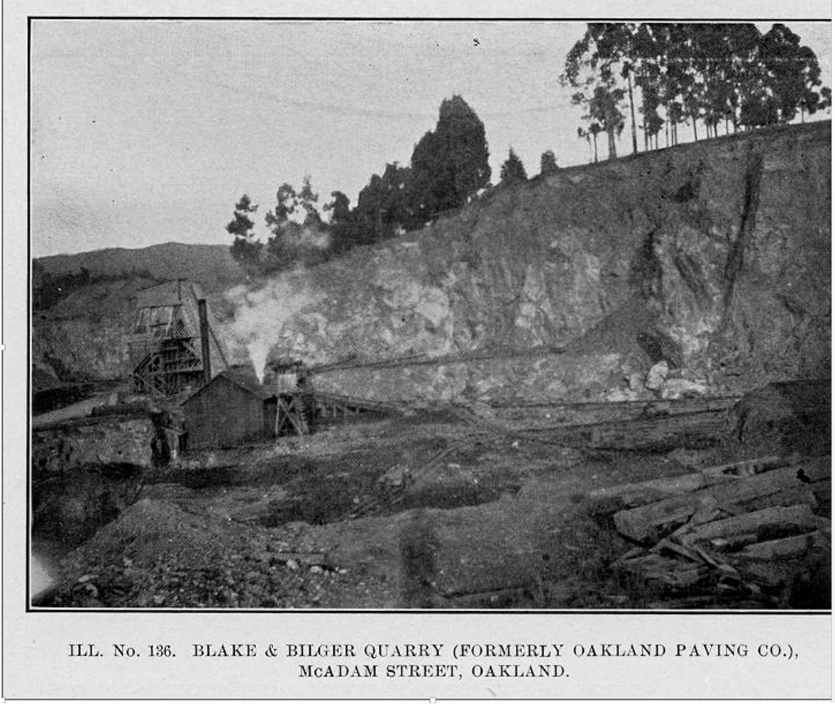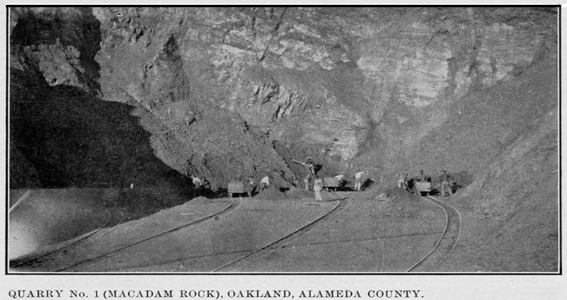 The Leona Heights rock quarry opened in 1909 a mile northeast up the hill. The quarry, its face being over 125 feet high, operated with a crew of thirty five men. Two gravity trams, one 2500 Ft. long, the other, 1200 ft., along with concrete chutes, would take the rock from the quarry down to the crusher and then loaded to be transported by rail. The rock was a fine-grained basalt and is used for roadway macadam and concrete. macadam getting its name from John Loudon McAdams, a process he invented in 1816 using aggregate stone for road construction. The quarry had the perfect quality rock needed to make up the three two and smaller three quarter inch stones for a road. It was later when they poured tar on the cracks between the laid stones it would better support a load, giving the road mixture a new familiar name, Tarmac.