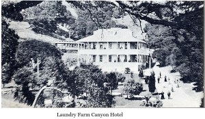 In 1876, a flat hilltop site above the canyon, referred to as Observatory Hill becoming a popular picnic spot, a foot trail led high up above the creek to the meadow on top of the hill with a 360 degree view of the surroundings. an enterprising man named Lane ran a 4-horse-drawn canopy sightseeing tour buses up the hill. Later in 1887 the Laundry Farm Railroad was built across the Mills property, the incorporated Mills Seminary, now renamed Mills College. The railroad continued north into the laundry farm Canyon across the creek from where the original laundry shack had stood, a Car Barn being build where the trains were switched and stored. With the scenic area becoming a major attraction the 3-story Laundry Farm Hotel was built in 1892, a quarter-mile east of the Car Barn on a 200 acre site on the south bank of Leona Creek opposite of Observatory Hill. the railway track from the Car Barn was extended to provide service to the hotel. The hotel suffering a fire in 1897 but being rebuilt. the train service and tracks to the hotel removed in 1902, the track beds becoming roadways, but the hotel experiencing a second fire in 1907 and was not rebuilt .